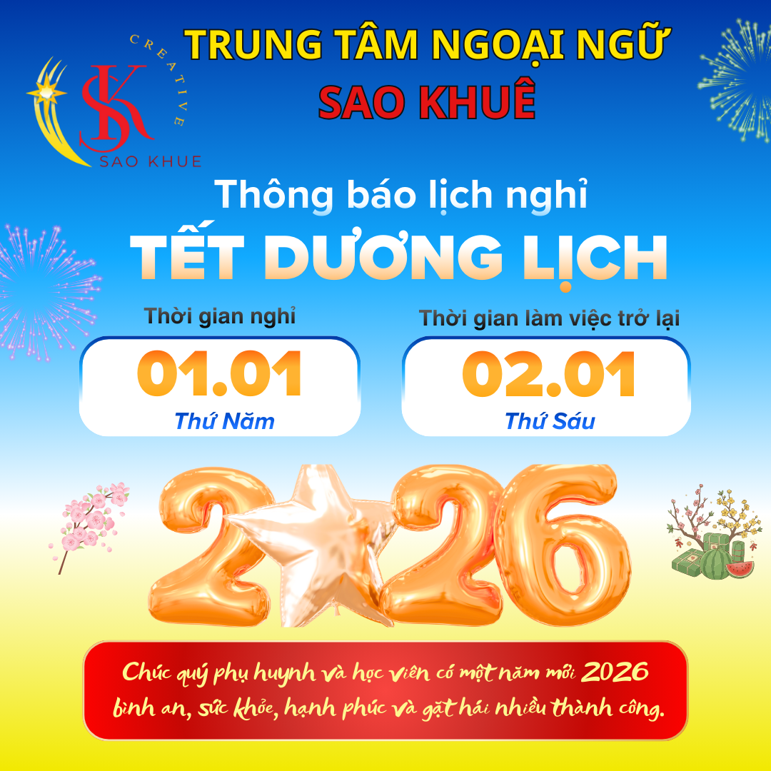 Trung tâm Ngoại ngữ Sao Khuê xin trân trọng thông báo lịch nghỉ Tết Dương lịch năm 2026, cụ thể như sau: